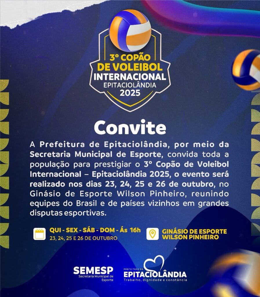 A Prefeitura de Epitaciolândia, por meio da Secretaria Municipal de Esporte, tem o prazer de convidar toda a população para participar do 3º Copão de Voleibol Internacional de Epitaciolândia 2025. O evento esportivo ocorrerá entre os dias 23 e 26 de outubro, no Ginásio de Esporte Wilson Pinheiro, e promete ser uma celebração vibrante do esporte e da integração cultural.