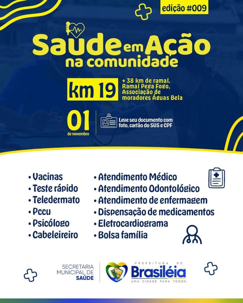 A Prefeitura de Brasiléia, por meio da Secretaria Municipal de Saúde, realizará no próximo sábado, dia 1º de novembro, a 9ª edição do programa “Saúde em Ação na Comunidade”, levando uma série de serviços de saúde e cidadania aos moradores da Associação Belas Águas, localizada no Ramal do Pega Fogo, km 19 + 38.