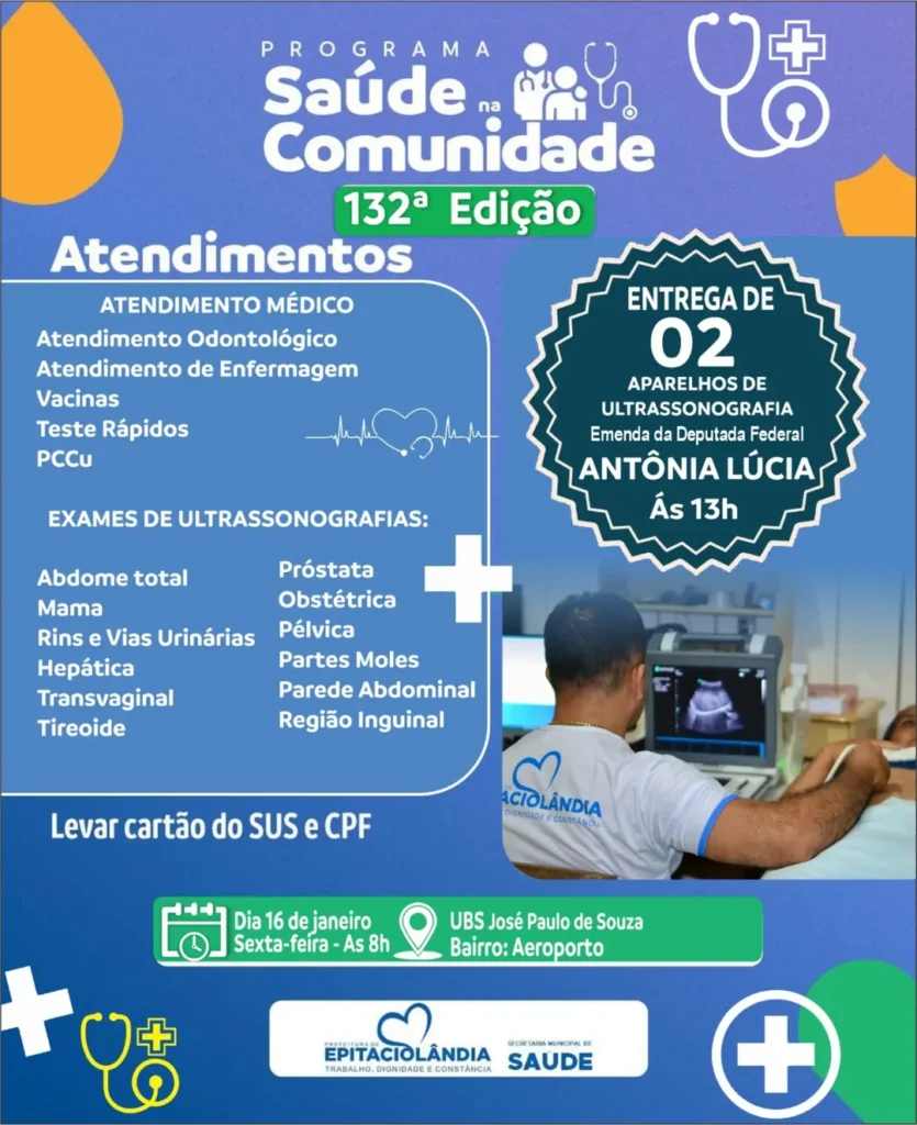 A Prefeitura de Epitaciolândia promove, na próxima sexta-feira, 16 de janeiro de 2026, a 132ª edição do programa Saúde na Comunidade, consolidando a iniciativa como uma das maiores ações de promoção à saúde e prevenção de doenças no município. A atividade será realizada a partir das 8h da manhã, na Unidade Básica de Saúde José Paulo de Souza, localizada no bairro Aeroporto.