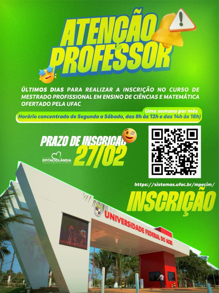 A Prefeitura de Epitaciolândia reafirma seu papel como indutora de conhecimento e valorização do funcionalismo público ao convocar os profissionais da educação para uma oportunidade estratégica de qualificação: o Mestrado Profissional em Ensino de Ciências e Matemática (MPECIM), oferecido pela Universidade Federal do Acre (UFAC).