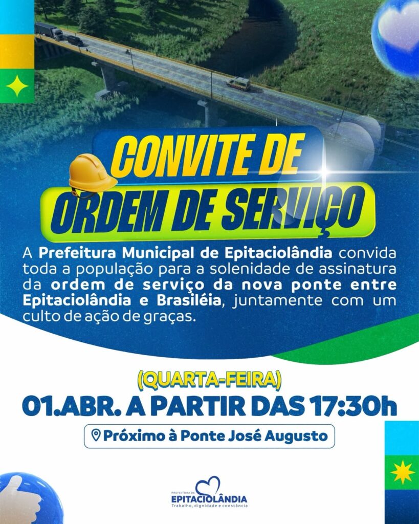 A Prefeitura Municipal de Epitaciolândia realiza nesta quarta-feira, 1º de abril, a solenidade de assinatura da ordem de serviço para a construção da nova ponte, em um momento considerado importante para a mobilidade urbana e o desenvolvimento da cidade.